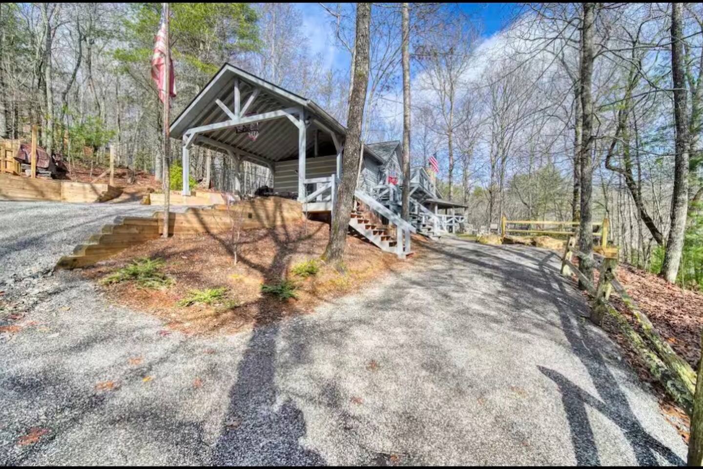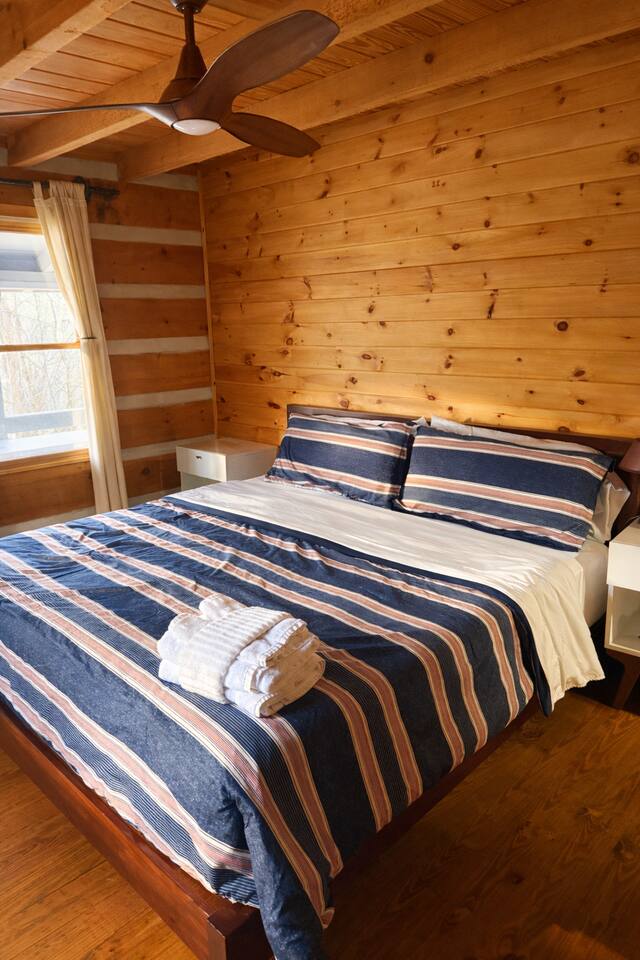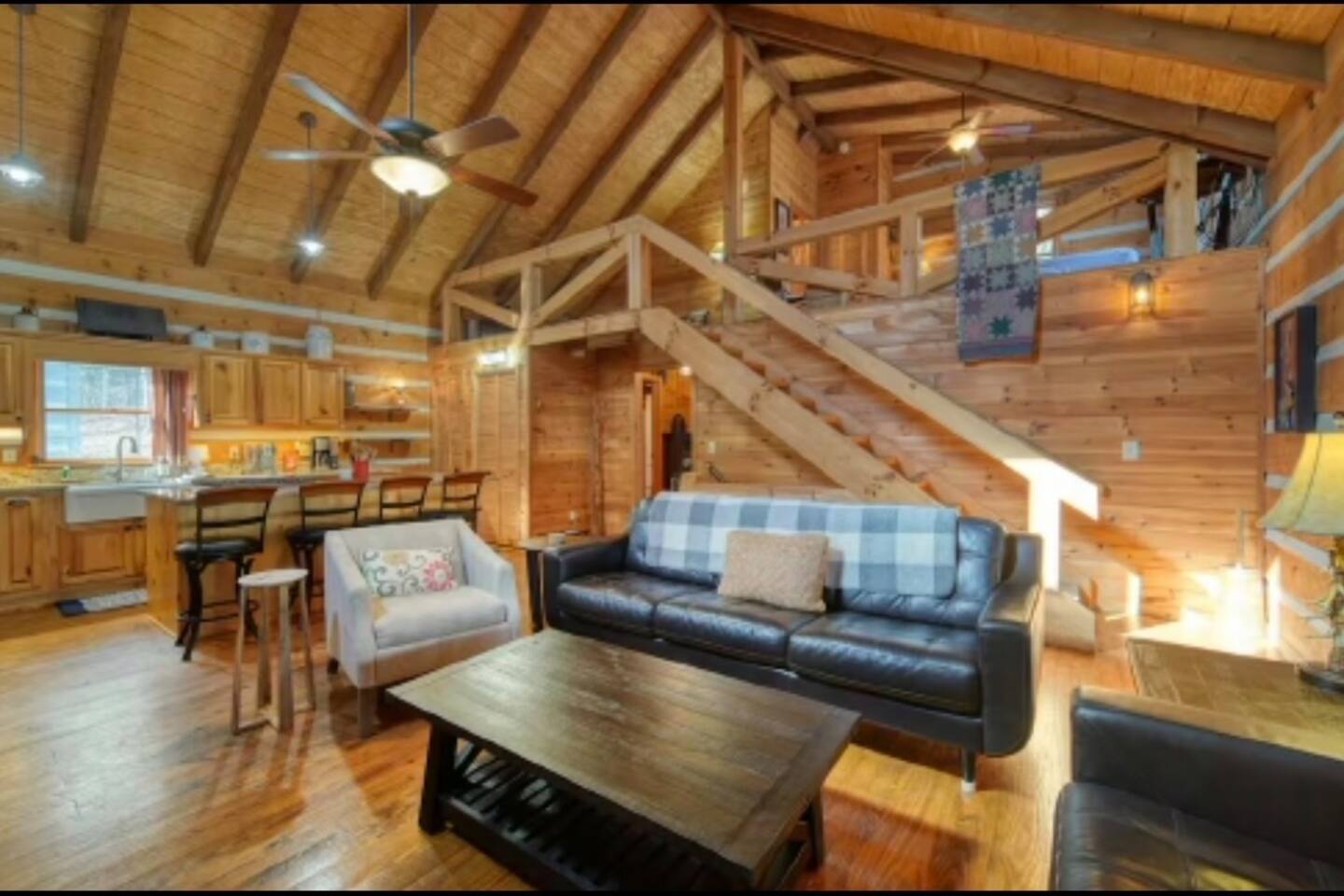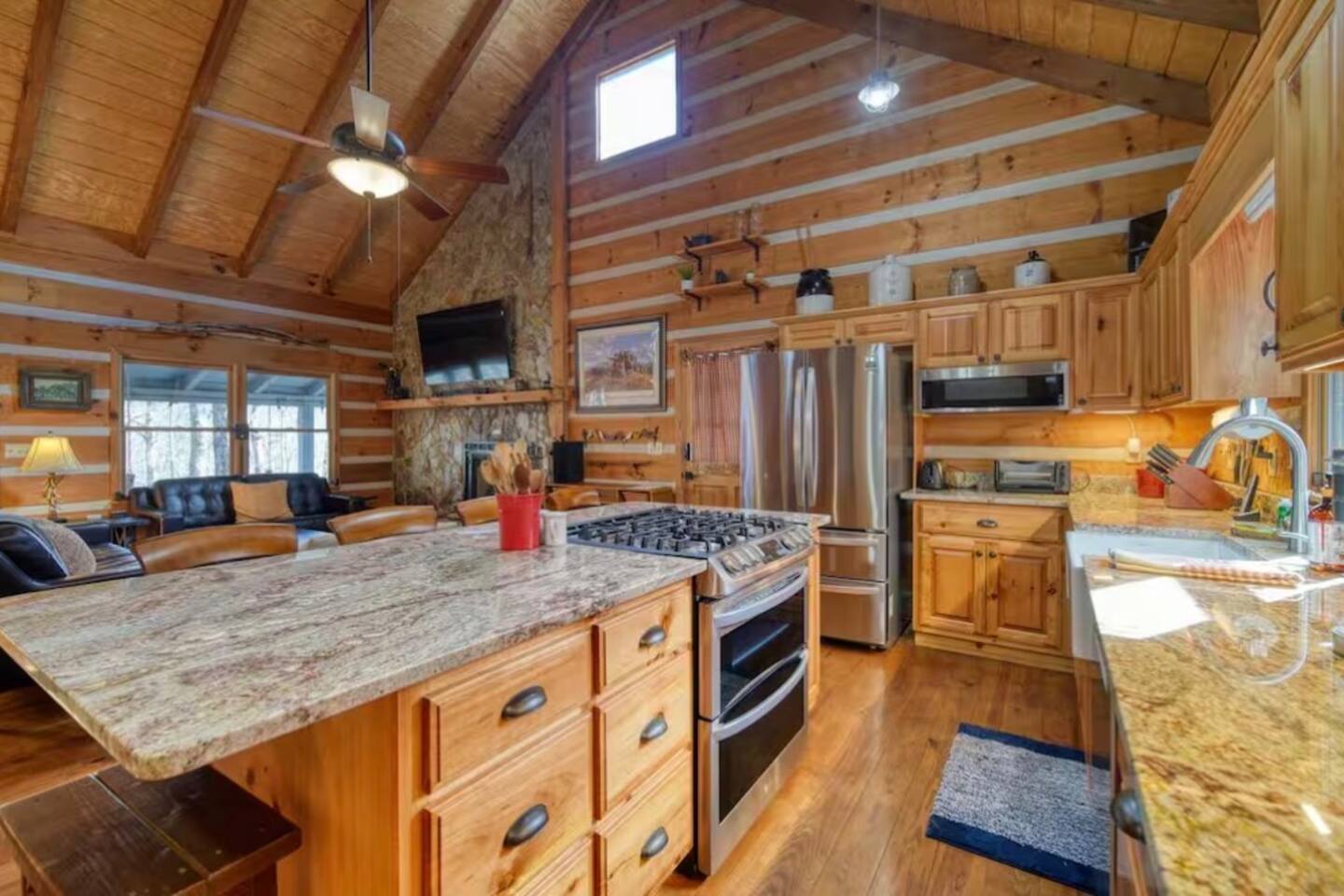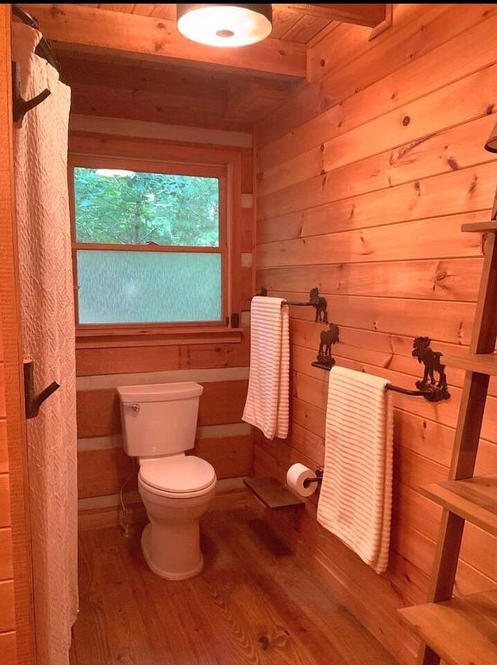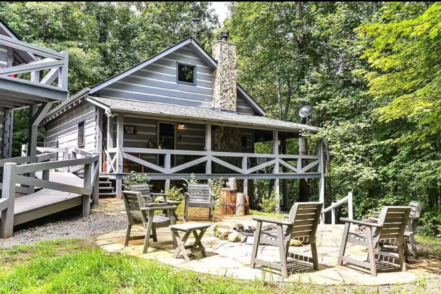 Welcome to Campfire Cabin, a spacious mountain retreat in the peaceful Aska Adventure Area, designed for families and groups who want room to relax, reconnect, and enjoy the outdoors. Set on a private 1-acre lot, this authentic wood cabin offers multiple decks, forest views, and cozy gathering spaces. Whether you’re soaking in the hot tub, sharing meals on the porch, or roasting marshmallows by the fire, Campfire Cabin is all about slowing down and enjoying mountain life. 🔥 Outdoor Living The outdoor space is where this cabin truly shines. The large fire pit area features plenty of seating, perfect for late nights under the stars telling stories and roasting s’mores. Firewood is included. The wraparound front porch overlooks the trees and features a porch swing and a large handcrafted wooden dining table with seating for 12, perfect for morning coffee or dinner with family and friends. Downstairs you’ll find a private hot tub deck tucked into the trees, the perfect place to relax after a day exploring Blue Ridge. The property also includes a fenced yard area for pets, grassy space to enjoy the outdoors, and parking for 2–3 vehicles. 🎮 Outdoor Games & Fun For some friendly competition, head to the game area in the garage with air hockey and foosball. There is also a ping pong table and basketball hoop under the covered parking area. Plenty of space to play, laugh, and enjoy time together. 🍳 Kitchen & Dining The kitchen was designed for gathering. It features a large island with gas cooktop, double ovens, granite countertops, farmhouse sink, and everything needed to prepare family meals. Enjoy both a Keurig and drip coffee maker, with coffee provided so mornings can start slow with a warm cup and mountain views. 🛋 Living Room The living room is warm and inviting with cathedral ceilings, comfortable leather seating, and a wood-burning fireplace. Firewood is provided so you can enjoy cozy evenings while watching your favorite shows on the smart TV. There is also a main level half bath for convenience. 🛏 Sleeping Spaces Campfire Cabin offers three spacious levels, perfect for large families or groups. Upstairs Loft Suite • King bed with luxury linens • Smart TV • Private full bathroom Downstairs Bedrooms • Two king bedrooms with luxury linens and smart TVs • Bunk room with full-size bunk beds Separate Queen bedroom suite with private entrance. ( not in the main house) • Queen Bed • Private bathroom and sitting area • separate outdoor sitting area Perfect for multiple families who want some privacy. 🚿 Bathrooms Bathrooms are stocked with body wash, shampoo, and conditioner to make packing easier. Laundry Room Washer and Dryer downstairs with starter laundry tabs. 🌲 The Campfire Cabin Experience With wraparound decks, peaceful forest views, outdoor games, and a fire pit made for gathering, Campfire Cabin is the kind of place where memories happen naturally. Morning coffee on the porch. Afternoons playing games with family. Evenings soaking in the hot tub. Nights around the fire under a sky full of stars. Peaceful, spacious, and designed for groups, it’s the perfect mountain escape just 27 minutes from downtown Blue Ridge.