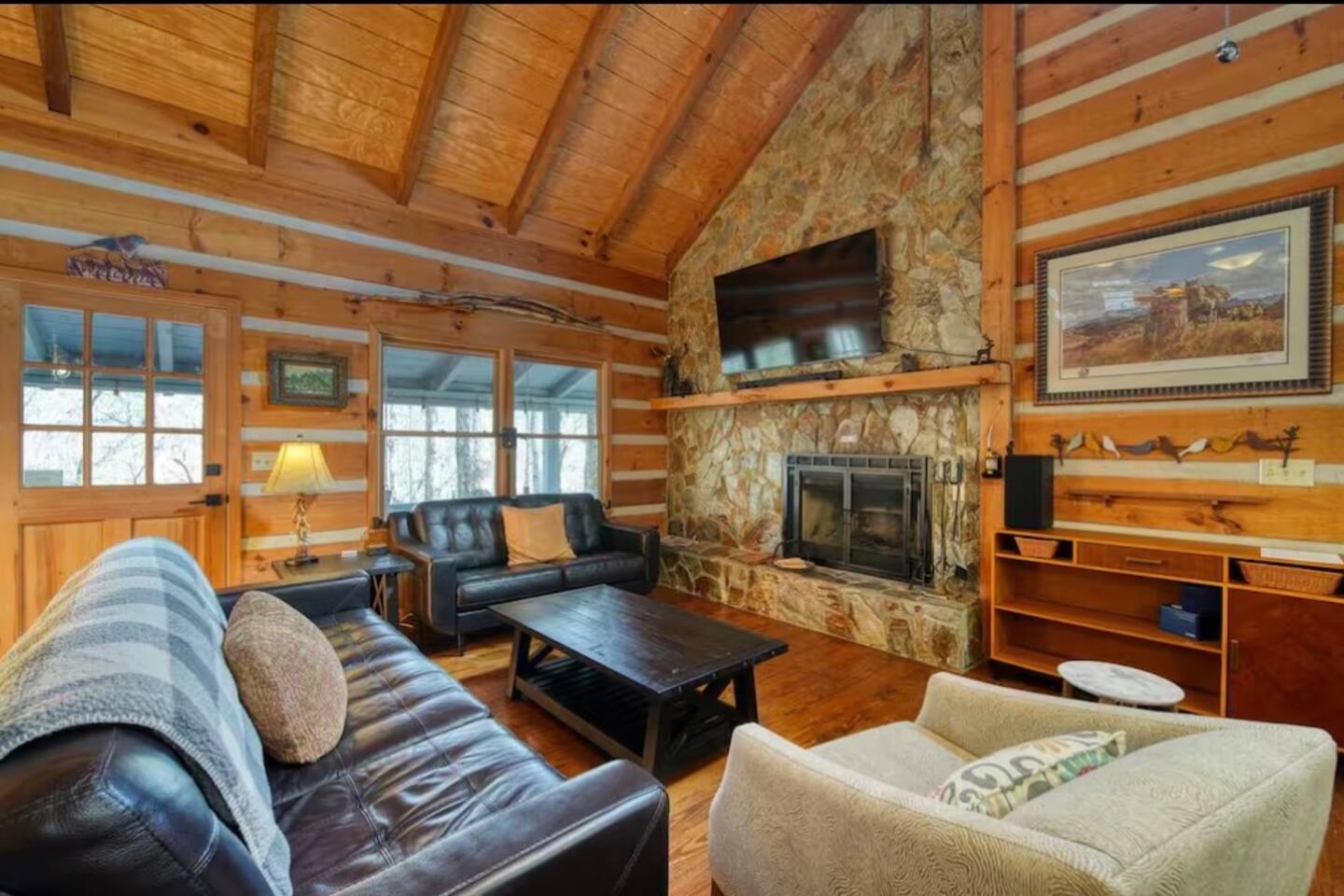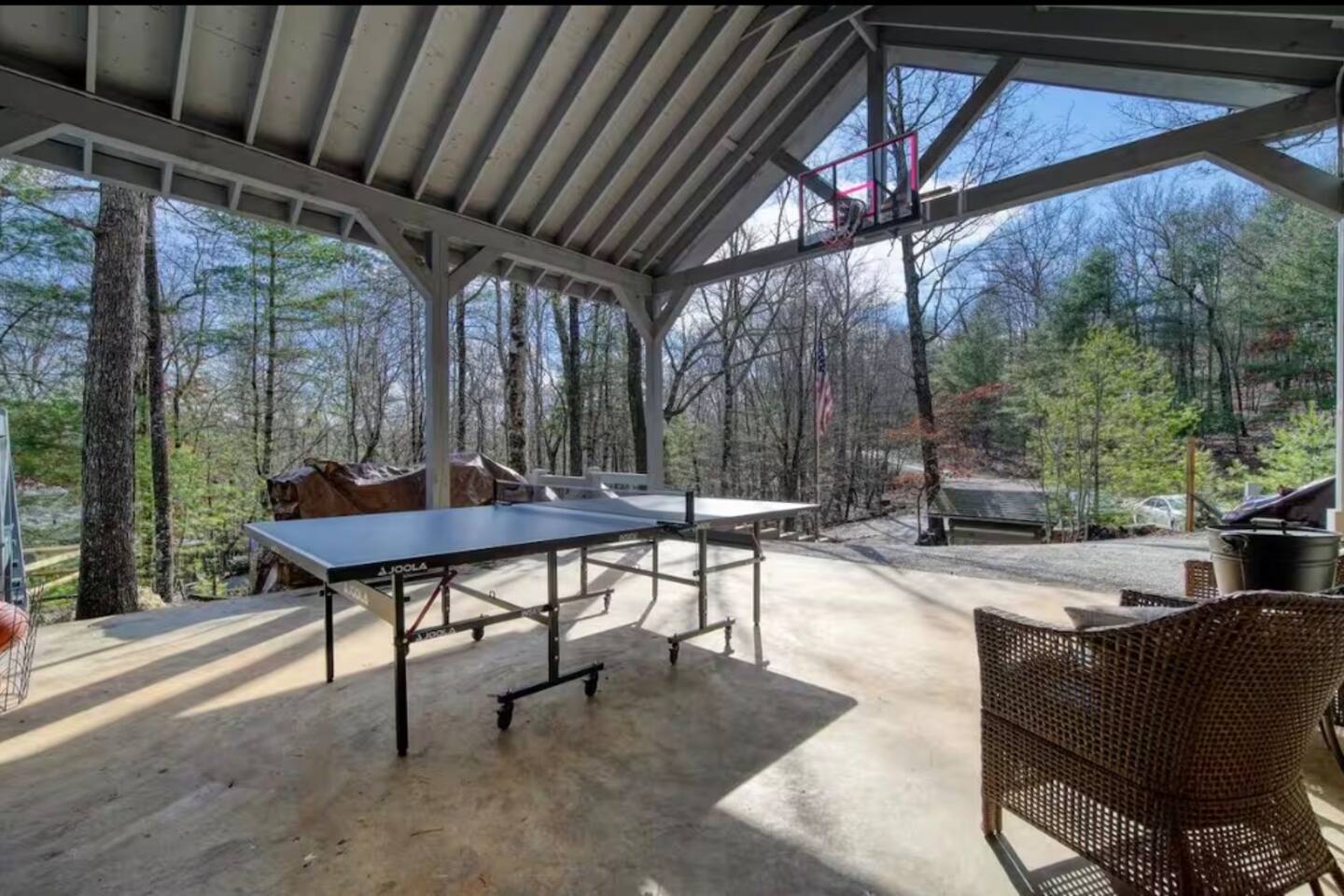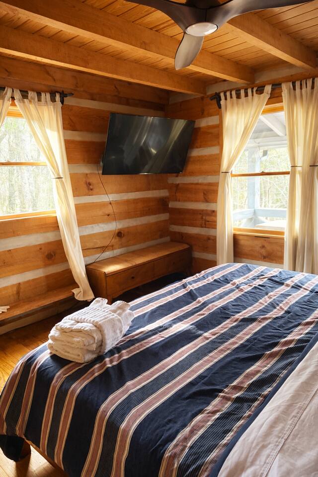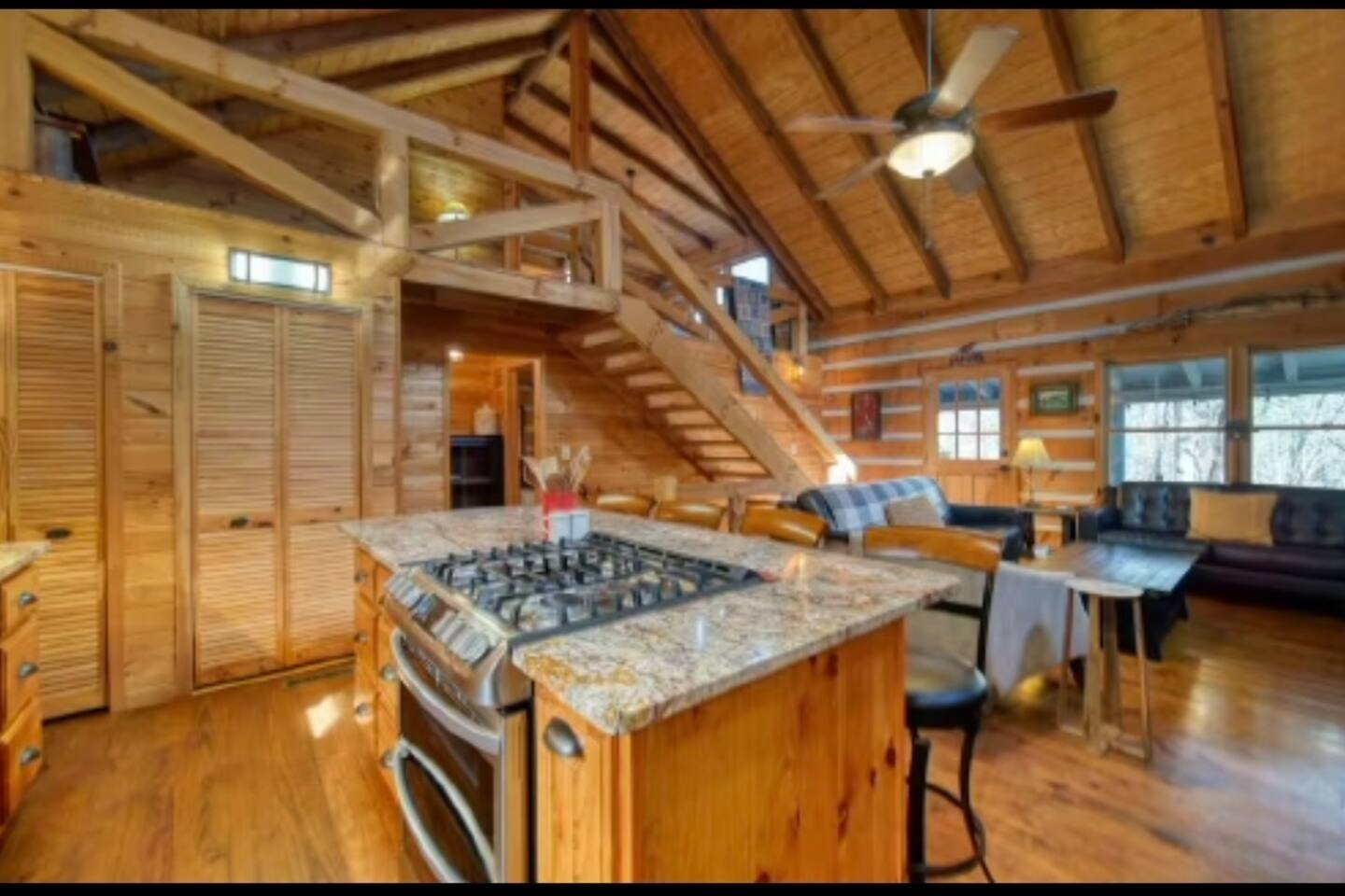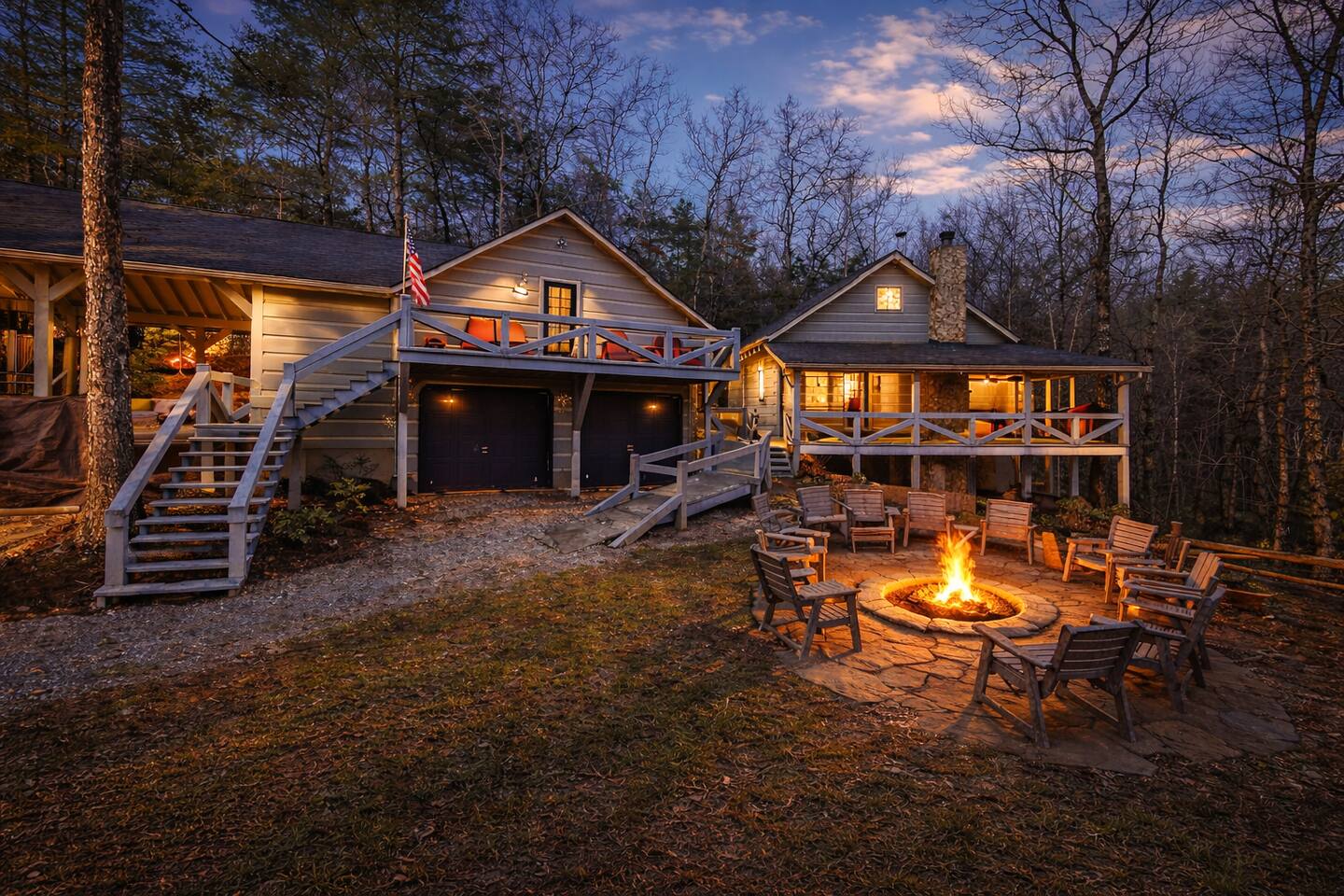 Welcome to Campfire Cabin, a spacious mountain retreat in the peaceful Aska Adventure Area, designed for families and groups who want room to relax, reconnect, and enjoy the outdoors. Set on a private 1-acre lot, this authentic wood cabin offers multiple decks, forest views, and cozy gathering spaces. Whether you’re soaking in the hot tub, sharing meals on the porch, or roasting marshmallows by the fire, Campfire Cabin is all about slowing down and enjoying mountain life. 🔥 Outdoor Living The outdoor space is where this cabin truly shines. The large fire pit area features plenty of seating, perfect for late nights under the stars telling stories and roasting s’mores. Firewood is included. The wraparound front porch overlooks the trees and features a porch swing and a large handcrafted wooden dining table with seating for 12, perfect for morning coffee or dinner with family and friends. Downstairs you’ll find a private hot tub deck tucked into the trees, the perfect place to relax after a day exploring Blue Ridge. The property also includes a fenced yard area for pets, grassy space to enjoy the outdoors, and parking for 2–3 vehicles. 🎮 Outdoor Games & Fun For some friendly competition, head to the game area in the garage with air hockey and foosball. There is also a ping pong table and basketball hoop under the covered parking area. Plenty of space to play, laugh, and enjoy time together. 🍳 Kitchen & Dining The kitchen was designed for gathering. It features a large island with gas cooktop, double ovens, granite countertops, farmhouse sink, and everything needed to prepare family meals. Enjoy both a Keurig and drip coffee maker, with coffee provided so mornings can start slow with a warm cup and mountain views. 🛋 Living Room The living room is warm and inviting with cathedral ceilings, comfortable leather seating, and a wood-burning fireplace. Firewood is provided so you can enjoy cozy evenings while watching your favorite shows on the smart TV. There is also a main level half bath for convenience. 🛏 Sleeping Spaces Campfire Cabin offers three spacious levels, perfect for large families or groups. Upstairs Loft Suite • King bed with luxury linens • Smart TV • Private full bathroom Downstairs Bedrooms • Two king bedrooms with luxury linens and smart TVs • Bunk room with full-size bunk beds Separate Queen bedroom suite with private entrance. ( not in the main house) • Queen Bed • Private bathroom and sitting area • separate outdoor sitting area Perfect for multiple families who want some privacy. 🚿 Bathrooms Bathrooms are stocked with body wash, shampoo, and conditioner to make packing easier. Laundry Room Washer and Dryer downstairs with starter laundry tabs. 🌲 The Campfire Cabin Experience With wraparound decks, peaceful forest views, outdoor games, and a fire pit made for gathering, Campfire Cabin is the kind of place where memories happen naturally. Morning coffee on the porch. Afternoons playing games with family. Evenings soaking in the hot tub. Nights around the fire under a sky full of stars. Peaceful, spacious, and designed for groups, it’s the perfect mountain escape just 27 minutes from downtown Blue Ridge.