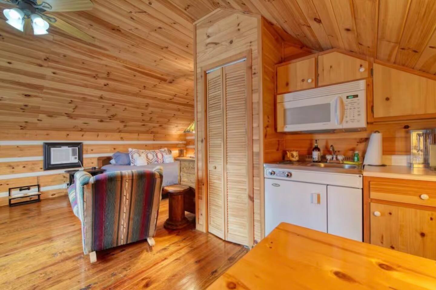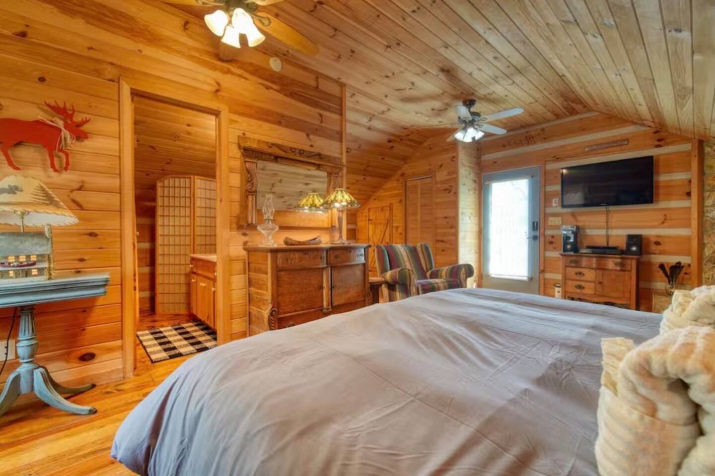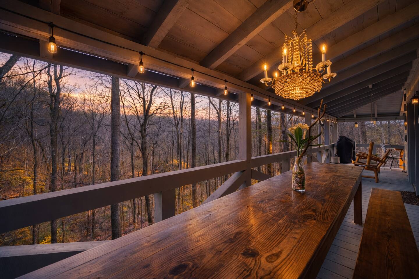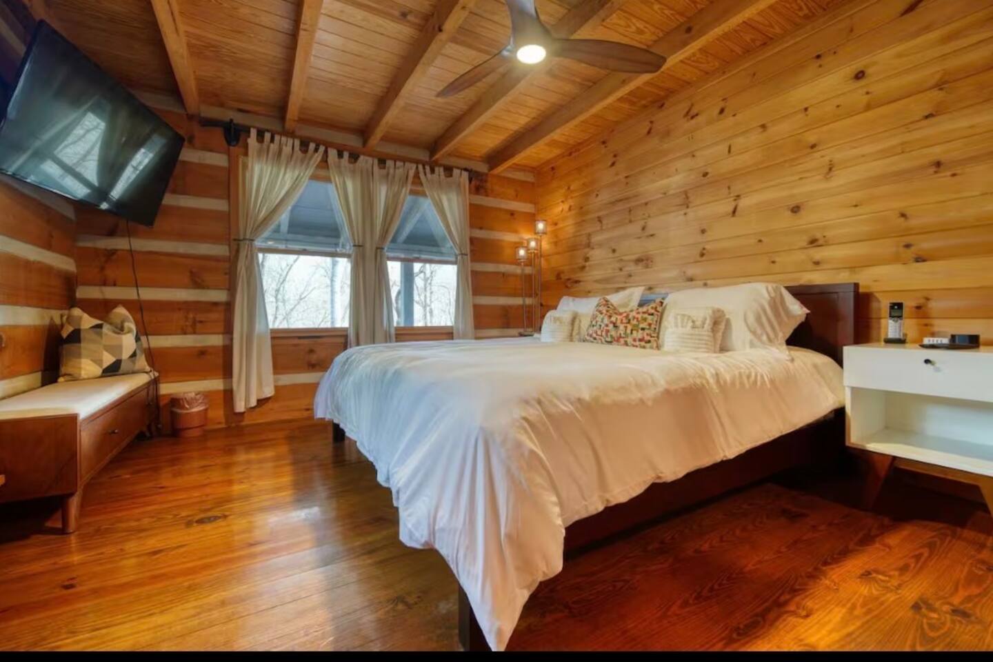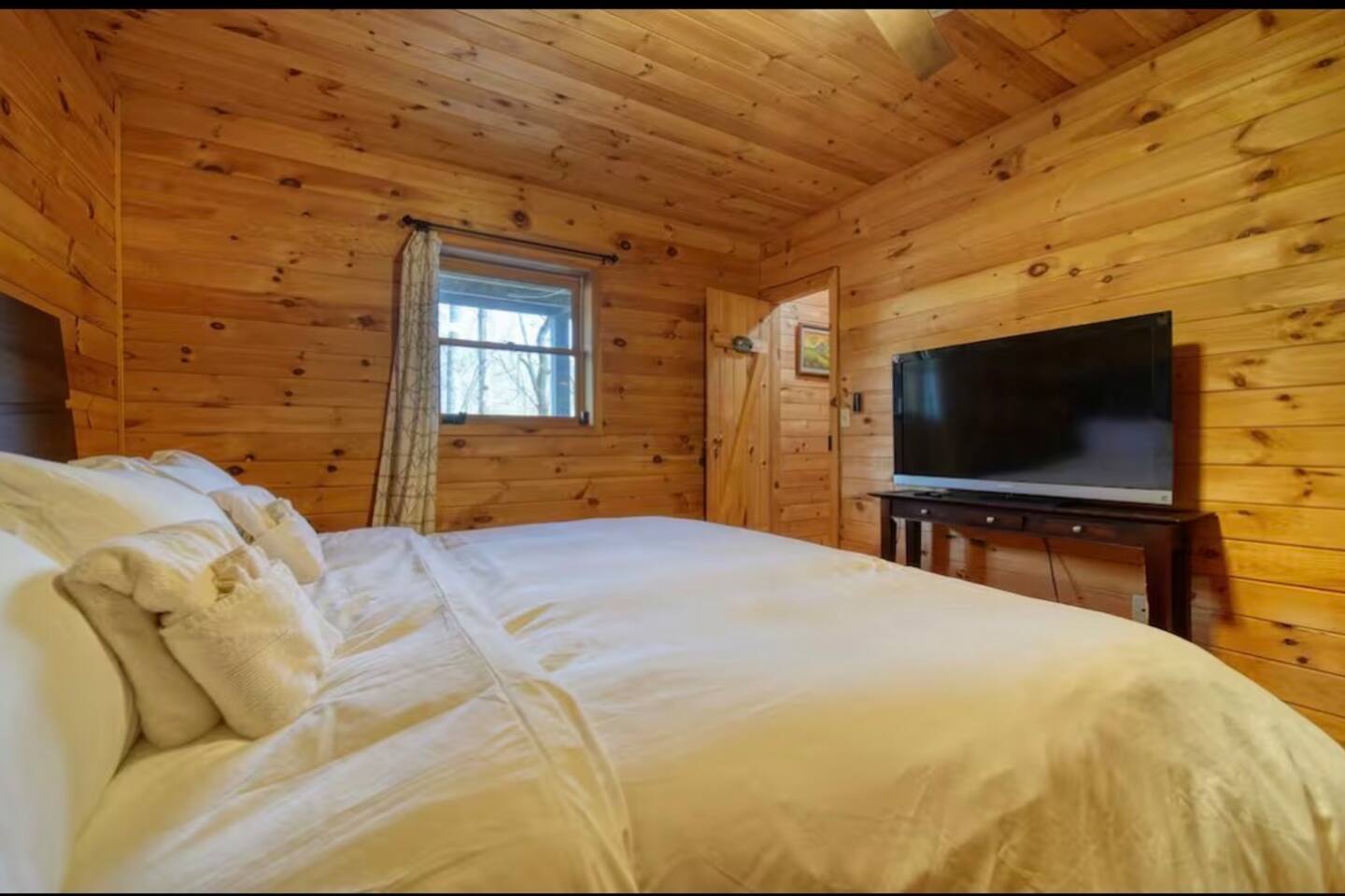Welcome to Campfire Cabin, a spacious mountain retreat in the peaceful Aska Adventure Area, designed for families and groups who want room to relax, reconnect, and enjoy the outdoors. Set on a private 1-acre lot, this authentic wood cabin offers multiple decks, forest views, and cozy gathering spaces. Whether you’re soaking in the hot tub, sharing meals on the porch, or roasting marshmallows by the fire, Campfire Cabin is all about slowing down and enjoying mountain life. 🔥 Outdoor Living The outdoor space is where this cabin truly shines. The large fire pit area features plenty of seating, perfect for late nights under the stars telling stories and roasting s’mores. Firewood is included. The wraparound front porch overlooks the trees and features a porch swing and a large handcrafted wooden dining table with seating for 12, perfect for morning coffee or dinner with family and friends. Downstairs you’ll find a private hot tub deck tucked into the trees, the perfect place to relax after a day exploring Blue Ridge. The property also includes a fenced yard area for pets, grassy space to enjoy the outdoors, and parking for 2–3 vehicles. 🎮 Outdoor Games & Fun For some friendly competition, head to the game area in the garage with air hockey and foosball. There is also a ping pong table and basketball hoop under the covered parking area. Plenty of space to play, laugh, and enjoy time together. 🍳 Kitchen & Dining The kitchen was designed for gathering. It features a large island with gas cooktop, double ovens, granite countertops, farmhouse sink, and everything needed to prepare family meals. Enjoy both a Keurig and drip coffee maker, with coffee provided so mornings can start slow with a warm cup and mountain views. 🛋 Living Room The living room is warm and inviting with cathedral ceilings, comfortable leather seating, and a wood-burning fireplace. Firewood is provided so you can enjoy cozy evenings while watching your favorite shows on the smart TV. There is also a main level half bath for convenience. 🛏 Sleeping Spaces Campfire Cabin offers three spacious levels, perfect for large families or groups. Upstairs Loft Suite • King bed with luxury linens • Smart TV • Private full bathroom Downstairs Bedrooms • Two king bedrooms with luxury linens and smart TVs • Bunk room with full-size bunk beds Separate Queen bedroom suite with private entrance. ( not in the main house) • Queen Bed • Private bathroom and sitting area • separate outdoor sitting area Perfect for multiple families who want some privacy. 🚿 Bathrooms Bathrooms are stocked with body wash, shampoo, and conditioner to make packing easier. Laundry Room Washer and Dryer downstairs with starter laundry tabs. 🌲 The Campfire Cabin Experience With wraparound decks, peaceful forest views, outdoor games, and a fire pit made for gathering, Campfire Cabin is the kind of place where memories happen naturally. Morning coffee on the porch. Afternoons playing games with family. Evenings soaking in the hot tub. Nights around the fire under a sky full of stars. Peaceful, spacious, and designed for groups, it’s the perfect mountain escape just 27 minutes from downtown Blue Ridge.