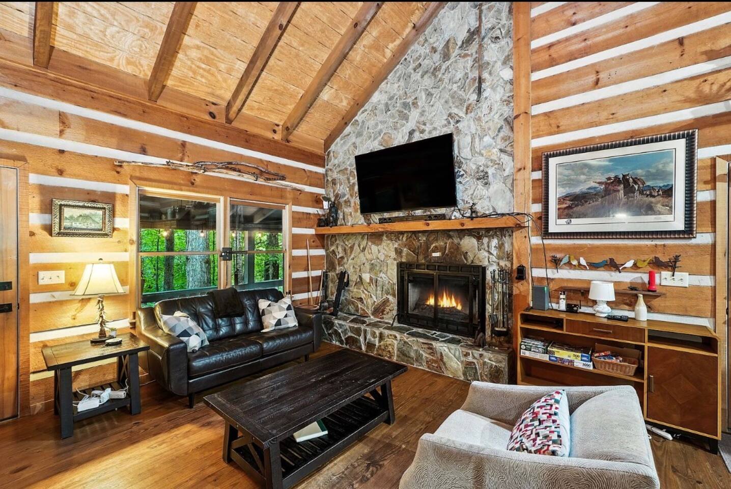 Campfire Cabin is a spacious mountain retreat in the Aska Adventure Area of Blue Ridge, perfect for groups and families. • 5BR / 4.5BA | Sleeps 12 • Private 1-acre lot • 27 min to downtown Blue Ridge • 3 Kings, bunk beds + queen suite • Hot tub & epic fire pit area (firewood included) • Large covered dining porch • Outdoor games: ping pong, air hockey, football, basketball • Pet friendly with fenced yard • Fully stocked kitchen & grill • Gravel road access & plenty of parking